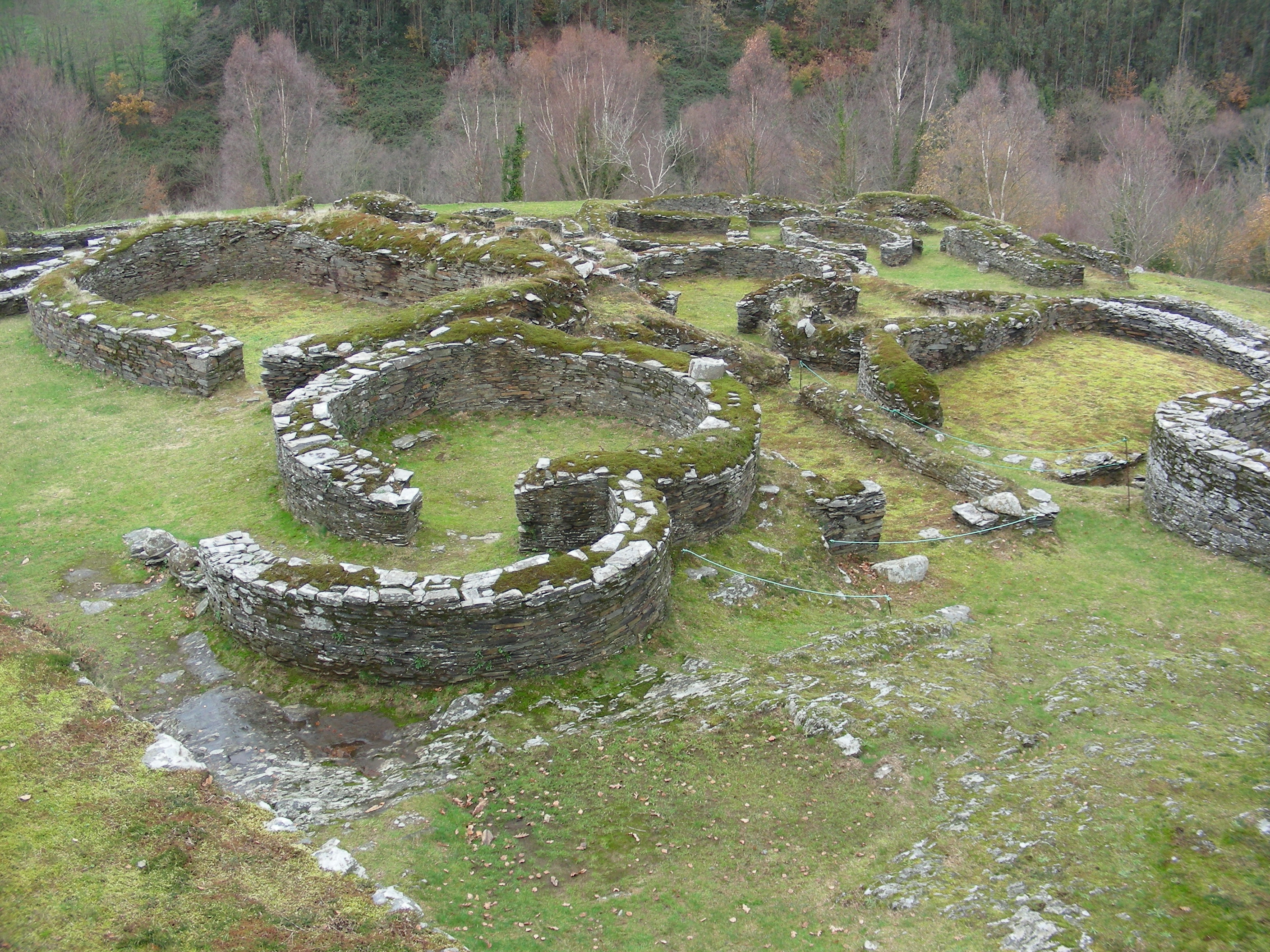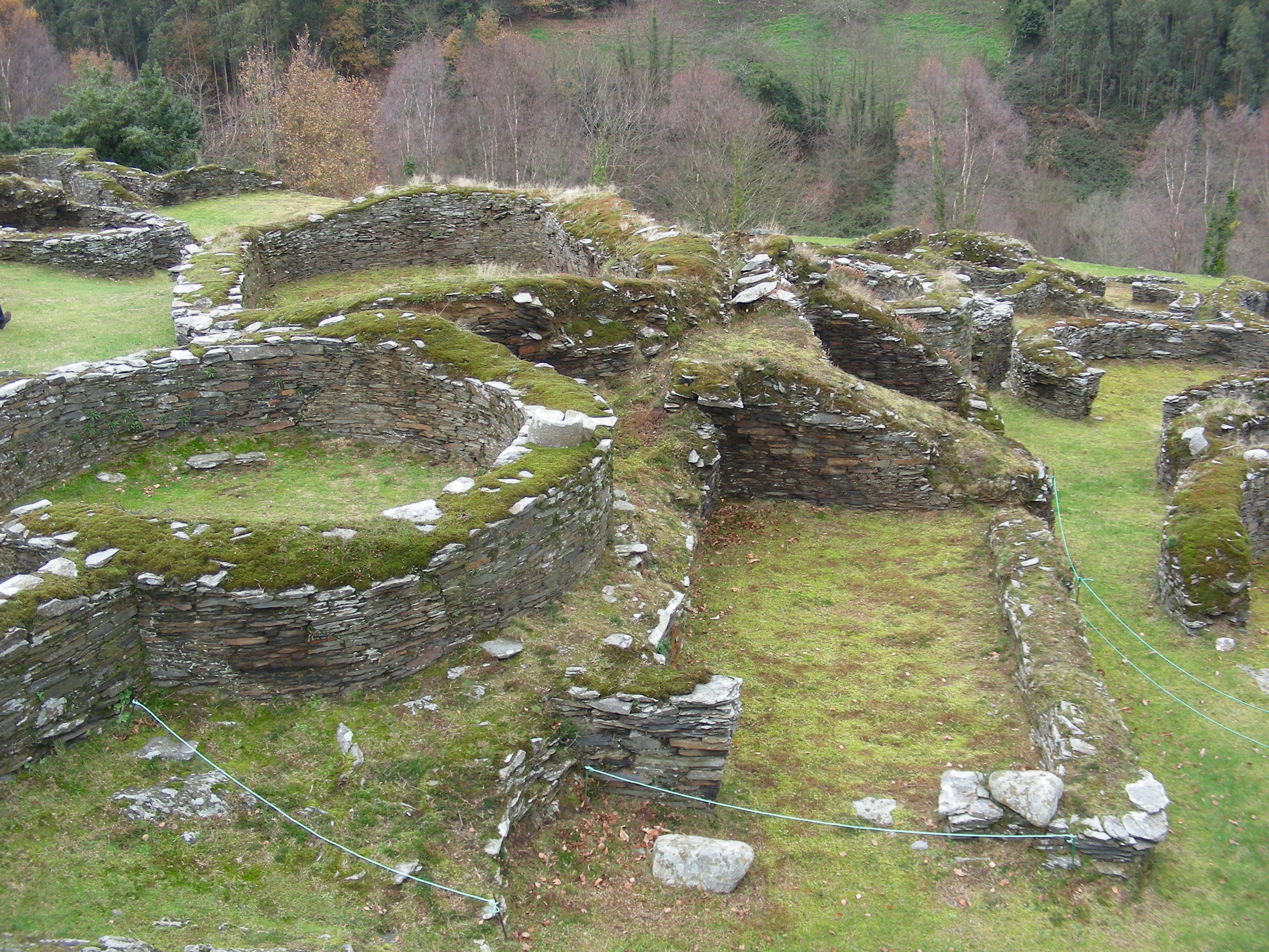 Les más de les estructures descubiertes estrémense en dos sectores: el d’arriba, tamién llamáu acrópolis, ye un espaciu ampliu cercáu por una muralla ancha, qu’en dalgunos tramos tien delantre dos fosos y bastiones de refuerzu, y que presenta escalinates al interior; y el d’abaxo, llamáu barriu norte, compuestu por una casería apetiguñada arrodiada por una muralla y que concentra cerca d’ ochenta edificaciones, onde predominen les plantes circulares anque nun falten otres ovales o rectangulares. Axúntense en garrapiellos uníos por plazoletes o caleyes no que paez un llaberintu constructivu, onde un percorríu posáu va dexanos ver la existencia de canalizaciones, pavimentos en chapacuña, bancos corríos, restos de llariegues y piedres con cazoletes. Nel sector suroriental del recintu fonderu llama l’atención la puerta d’entrada al castru, con dos cuerpos de guardia a cada llau; un gran torrexón de planta cuadrangular; y un conxuntu compuestu por dos instalaciones termales, asemeyaes a les qu’apaecen n’otres partes del noroeste de la península ibérica, y sobre manera nos castros asturianos de Pendia, Os Castros de Taramundi y El Chao Samartín.