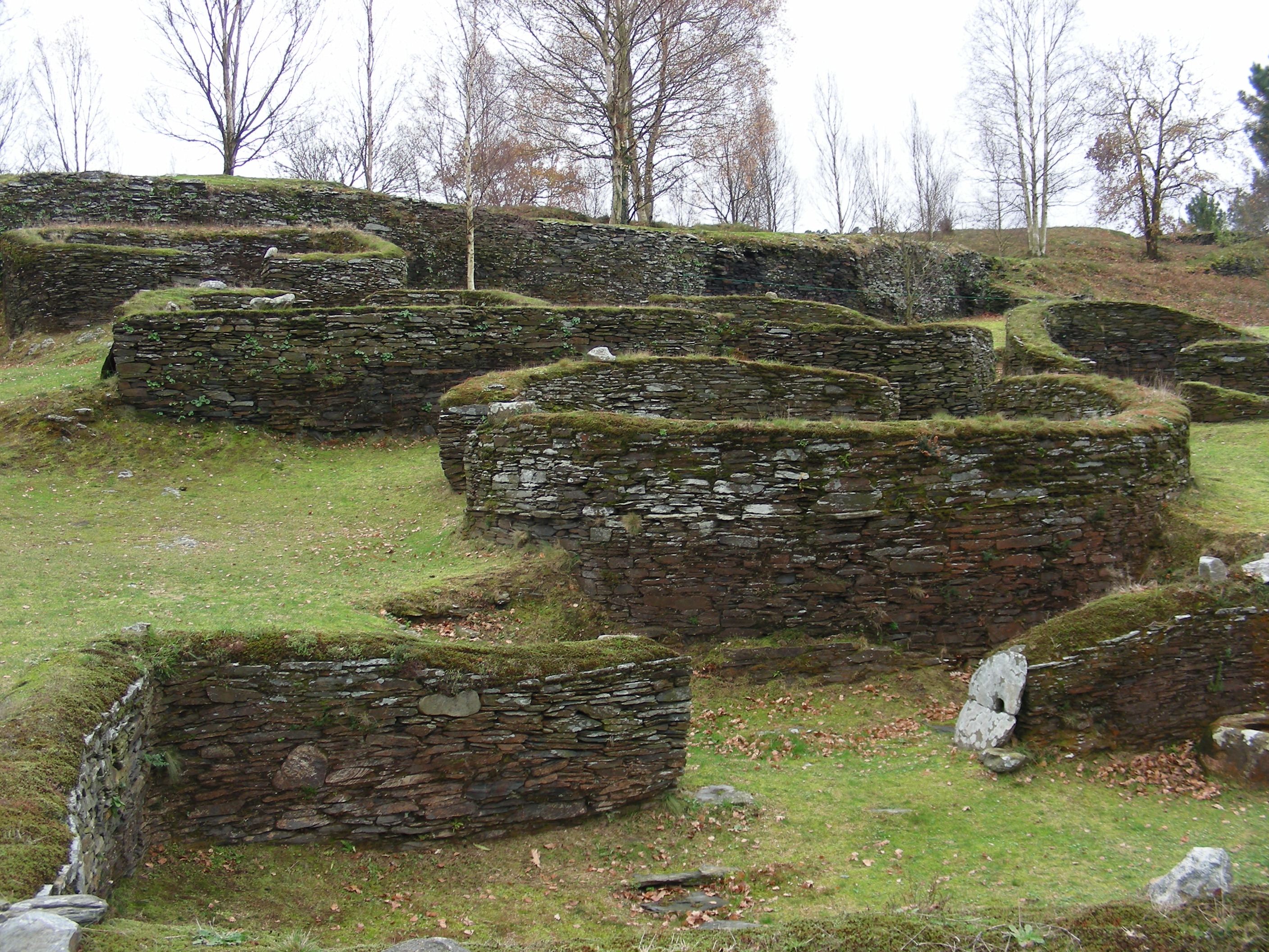 La mayor parte de las estructuras descubiertas se distribuyen en dos sectores: el superior, también llamado acrópolis, es un amplio espacio delimitado por una gruesa muralla, precedida en algunos tramos por dos fosos y reforzada por bastiones, y que presenta escalinatas al interior; y el inferior, llamado barrio norte, compuesto por un abigarrado caserío ceñido por una muralla y que concentra cerca de ochenta edificaciones, donde predominan las plantas circulares aunque no faltan otras ovales o rectangulares. Se agrupan en pequeños conjuntos unidos por plazuelas o callejones en un aparente laberinto constructivo, donde un pausado recorrido nos permitirá apreciar la existencia de canalizaciones, pavimentos en chapacuña, bancos corridos, restos de hogares y piedras con cazoletas. En el sector suroriental del recinto inferior destaca la puerta de entrada al castro, flanqueada por dos cuerpos de guardia; un gran torreón de planta cuadrangular; y un conjunto compuesto por dos instalaciones termales, similares a las que aparecen en otras zonas del noroeste de la península ibérica, y particularmente en los castros asturianos de Pendia, Os Castros de Taramundi y Chao Samartín.